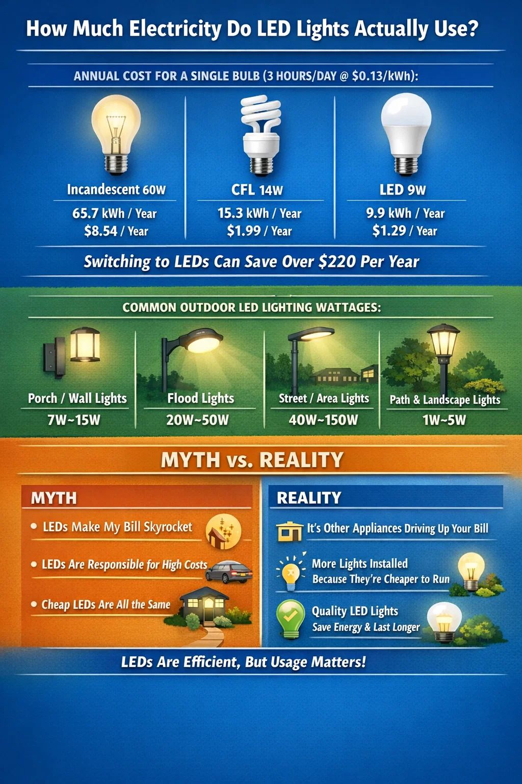 Lighting — even pre-LED — represents a small fraction of total home energy consumption. With LEDs, that fraction shrinks further. If your bill is high, the answer is almost certainly your HVAC system, water heater, or electric dryer — not your outdoor LED lighting.