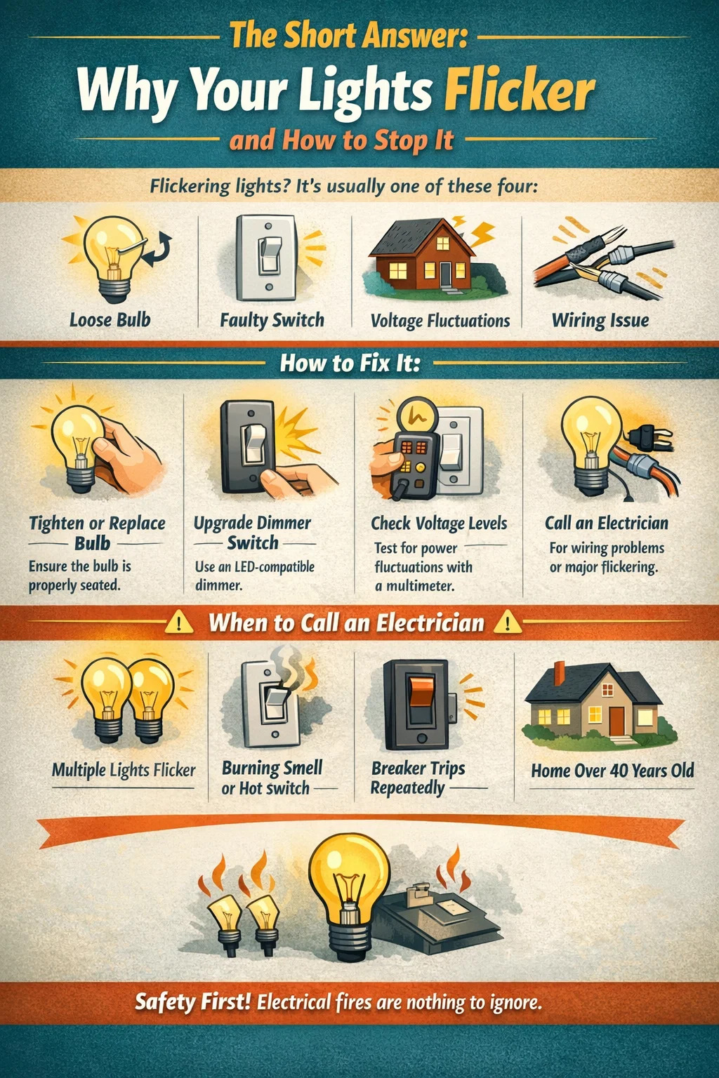 Flickering lights are almost always caused by one of four things: a loose or incompatible bulb, a faulty light switch, voltage fluctuations in your home's electrical supply, or a wiring problem somewhere in the circuit. In most cases, the fix is straightforward—tighten the bulb, replace a dimmer switch, or swap out an incompatible LED. However, if multiple lights flicker simultaneously or you notice flickering linked to large appliances turning on, you may have a more serious electrical issue that requires a licensed electrician.