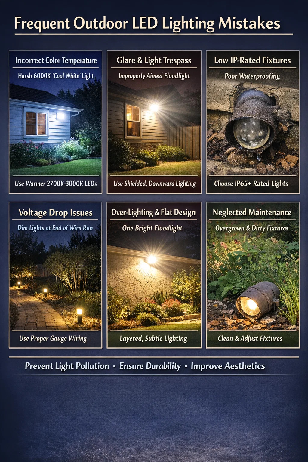 The most critical outdoor LED lighting mistakes involve excessive glare caused by improper fixture aiming, selecting the wrong color temperature (CCT), and neglecting the "Dark Sky" principles that prevent light pollution. Additionally, many property owners fail to account for voltage drop in low-voltage systems or purchase fixtures with inadequate Ingress Protection (IP) ratings, leading to premature hardware failure. Addressing these issues requires a balance between functional lumen output and mindful placement to ensure safety without compromising visual comfort.